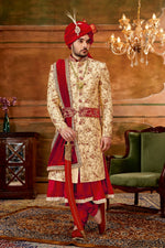 Golden Color Jacquard Fabric Hand Work Shrewani