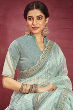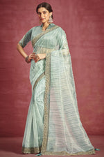 Creative Border Work On Sea Green Color Organza Fabric Saree