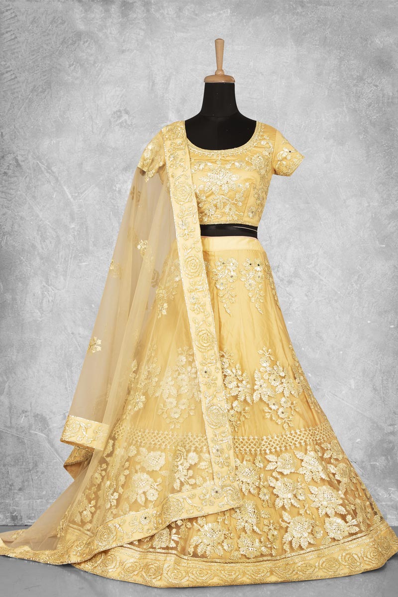 Net Fabric Yellow Color Lehenga With Winsome Embroidered Work